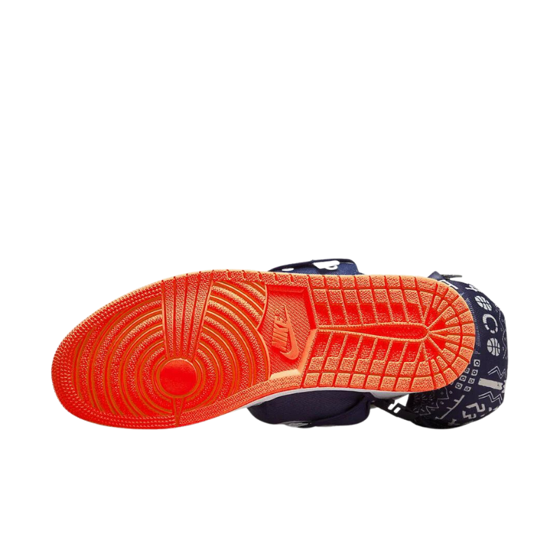 Air Jordan 1 Utility Q54 - это кроссовки созданные как часть коллекции коллаборации бренда Jordan и Quai 54. Quai 54 - ежегодный уличный баскетбольный турнир, ставший легендарным. В кроссовках используется парусиновая конструкция с темно-синим цветом и белыми накладками по всей поверхности. На боковых сторонах кроссовок виден потайной карман, который пытается гармонировать с кроссовками с накладкой Swoosh и логотипом Wings, напечатанным на клапане на лодыжке. На пятке кроссовки дополнены съемной сумкой. Также в комплекте идёт хлопковая сумка для переноски. На воротнике на щиколотке видны полоски, на язычке и стельке виден совместный брендинг, а завершают кроссовки белая межподошва и оранжевая подошва.